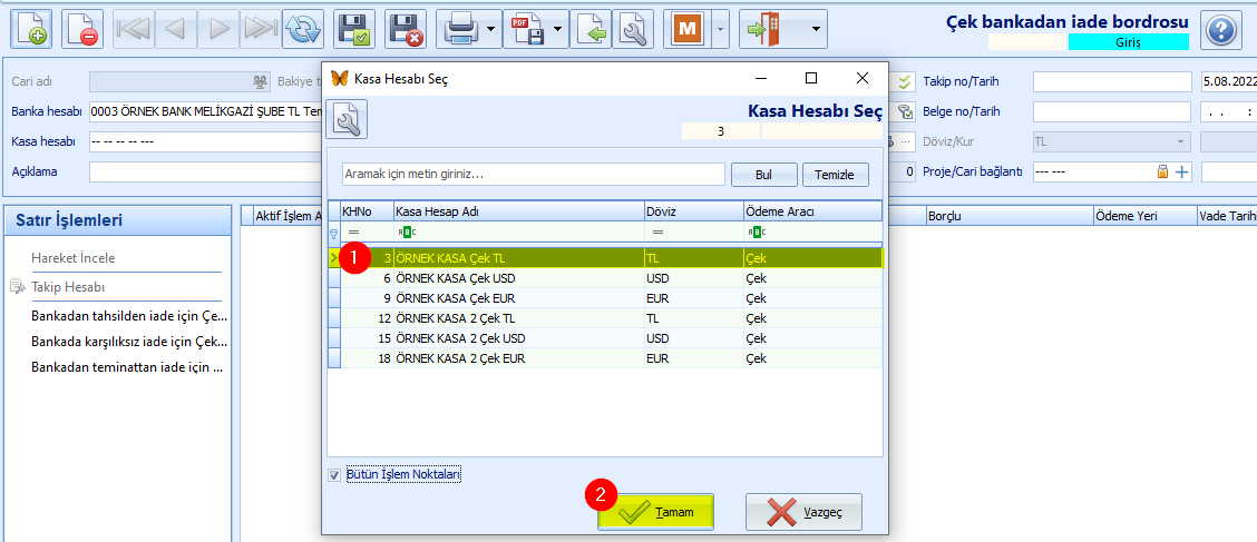 3.Açılan pencerede çekin iade alınacağı kasa (1) seçilir. Tamam (2) butonuna tıklanır.