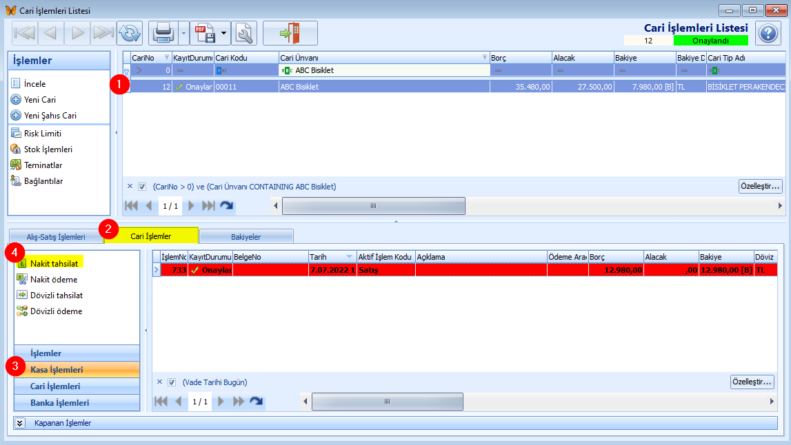 3.İŞLEMLER modülündeki Cari İşlemler penceresi açılır. Alış işleminin yapıldığı cari (1) seçilip alt bölümdeki Cari İşlemler (2) sekmesinde pencerenin sol bölümündeki Kasa İşlemleri (3) tıklanarak açılan bölümdeki Nakit Tahsilat (4) butonuna tıklanır.
