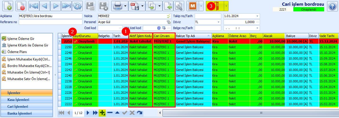 butonuna tıklanılarak Aktif İşlem Kodu, Cari Unvanı, Açıklama, Ödeme Aracı, Vade Tarihi ve işleme göre Borç veya Alacak alanlarına bilgi girilir. (1)