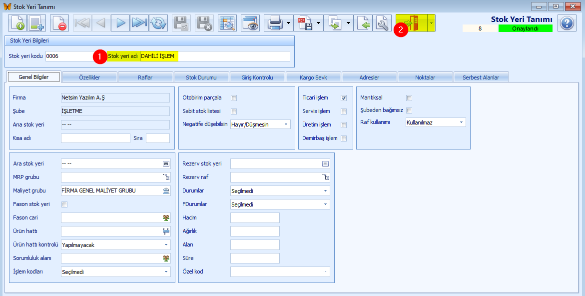 3.Stok yeri adı (1) alanına bilgi girilir. Kayıt Onaylandı (2) durumuna getirilir.