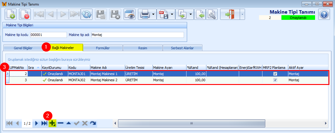 butonuna (2) tıklanılarak tipe bağlı Makine Adı girilir. Makinenin bulunduğu Üretim Tesisi seçilir. %Rand alanından randımanı belirlenir. Satırdaki kayıt Onaylandı (3) durumuna getirilir.