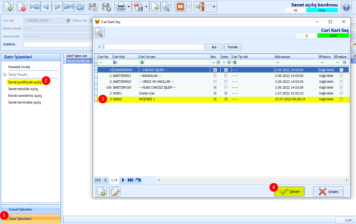 3.Açılan pencerede ilgili cari(3) seçilir. Tamam(4) butonuna tıklanır.