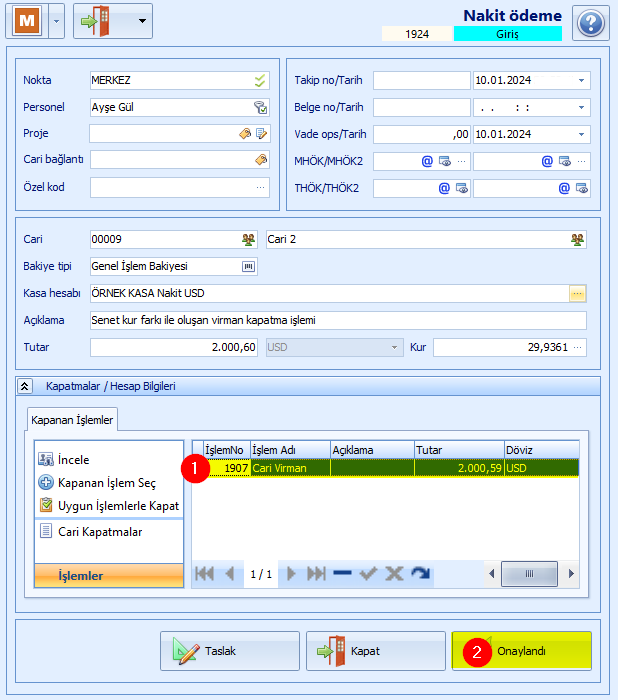 3. Virman kaydı satırda (1) sistem tarafından oluşturulur. Onaylandı (2) butonuna tıklanır.