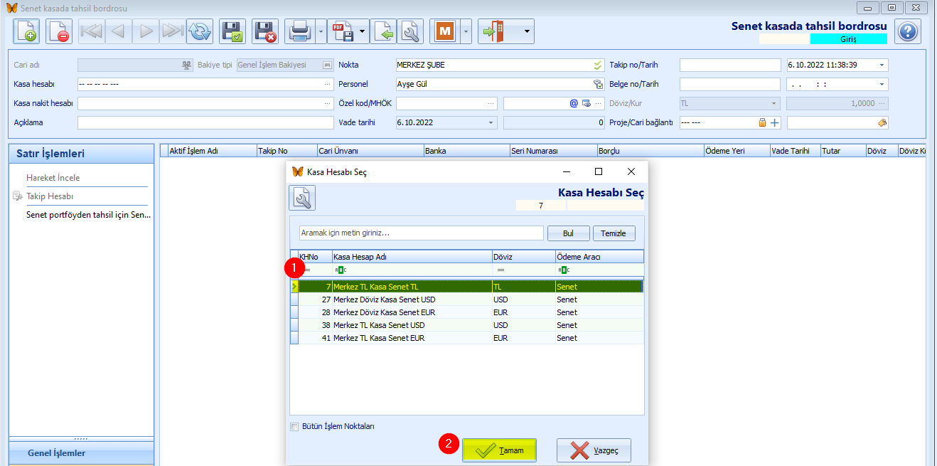 2.Açılan pencerede senedin portföyde olduğu kasası (1) seçilir. Tamam (2) butonuna tıklanır.