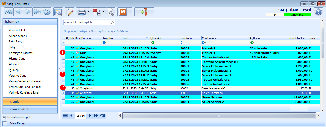 Carilere ait satış işlemlerinin tümünün listelenip aynı zamanda işlem yapılabildiği penceredir.