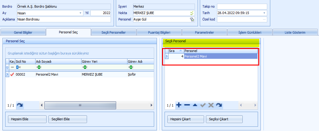 Seçilen personeller ise pencerenin sağ bölümündeki Seçili Personel alanına taşınır.