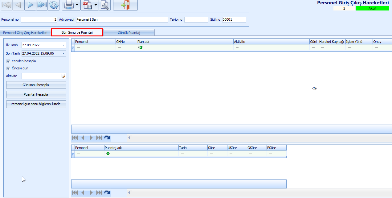 2.Gün Sonu ve Puantaj hesaplanır ve Personel Gün Sonu Bilgileri listelenir.
