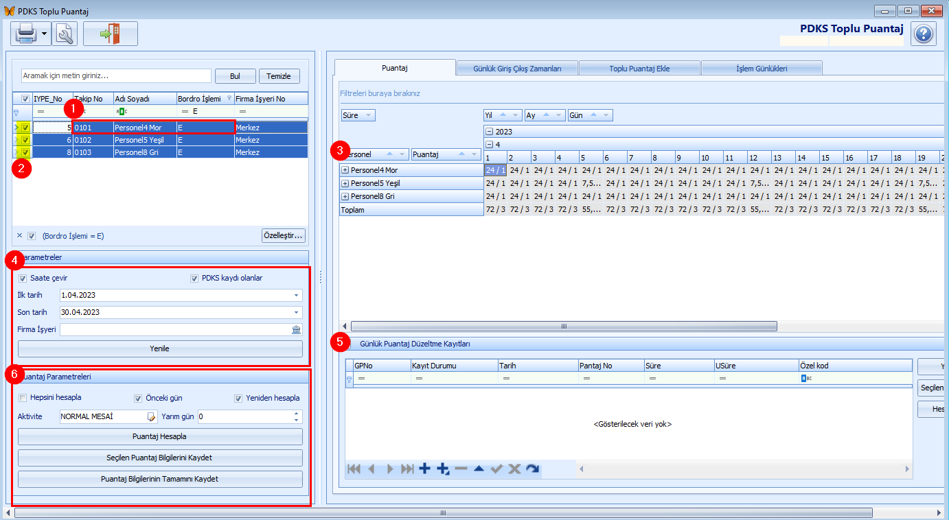 PDKS takip nosu bulunan ve bordro yapılan personel listelenir (1). Personel seçildikten (2) sonra pencerenin sağ tarafında puantaj listelenir (3). Listelenen bu alanda değişiklik yapılabilir ya da pencerenin alt tarafındaki Günlük Puantaj Bilgilerini Düzeltme bölümünde değişiklik yapılabilir.