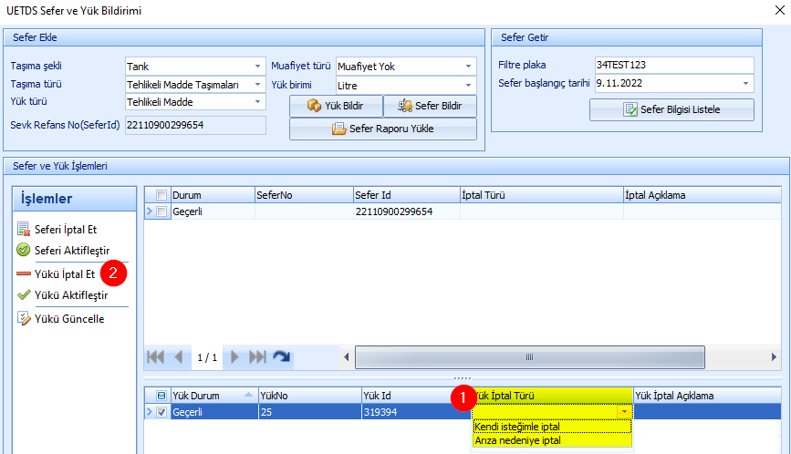 1.Yüke ait satır kaydındaki İptal Türü sütunundaki Kendi İsteğimle İptal / Arıza Nedeniyle İptal (1) seçeneklerinden birisi seçilerek pencerenin sol tarafındaki Yükü İptal Et (2) butonuna basılarak yük iptal edilir. İptal edilen yükün durumu İptal olur. Sonrasında tekrar Yük Bildir butonuna tıklanarak bildirim yapılabilir.