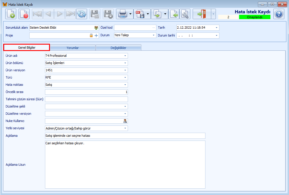 butonları kullanılarak hata istek kaydı ile ilgili durum değişikliği kaydı girilir.