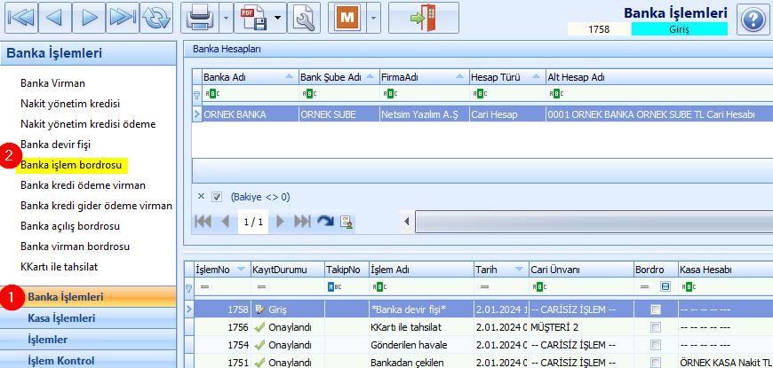 1.Açılan pencerenin sol tarafındaki Banka İşlemlerine (1) tıklanılarak açılan bölümdeki Banka işlem bordrosu (2) butonuna tıklanılır.