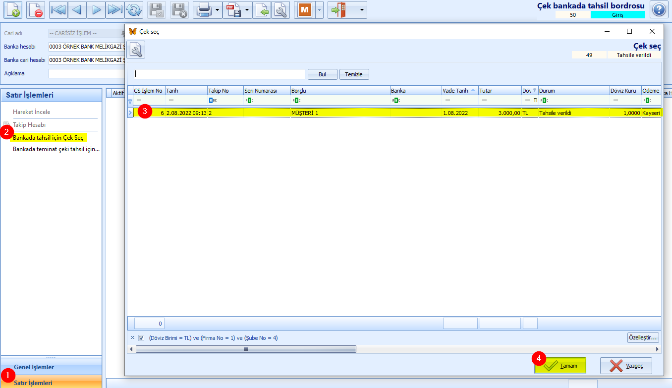 4.Açılan pencerede daha önce bankaya çıkış işlemi yapılmış olan çek(3) seçilir. Tamam(4) butonuna tıklanır.