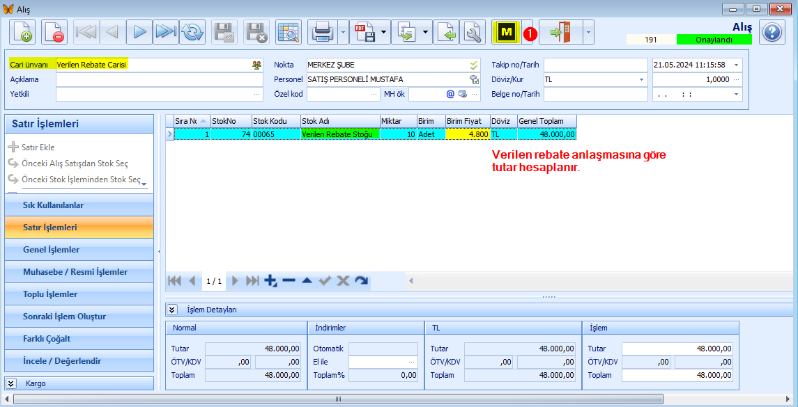 Verilen rebate anlaşmasında firmanın bir cariye yaptığı satış işlemlerine bağlı olarak cariye verdiği geri ödeme hesaplanır. Hesaplanan geri ödeme için sistem otomatik olarak alış kaydı oluşturur.