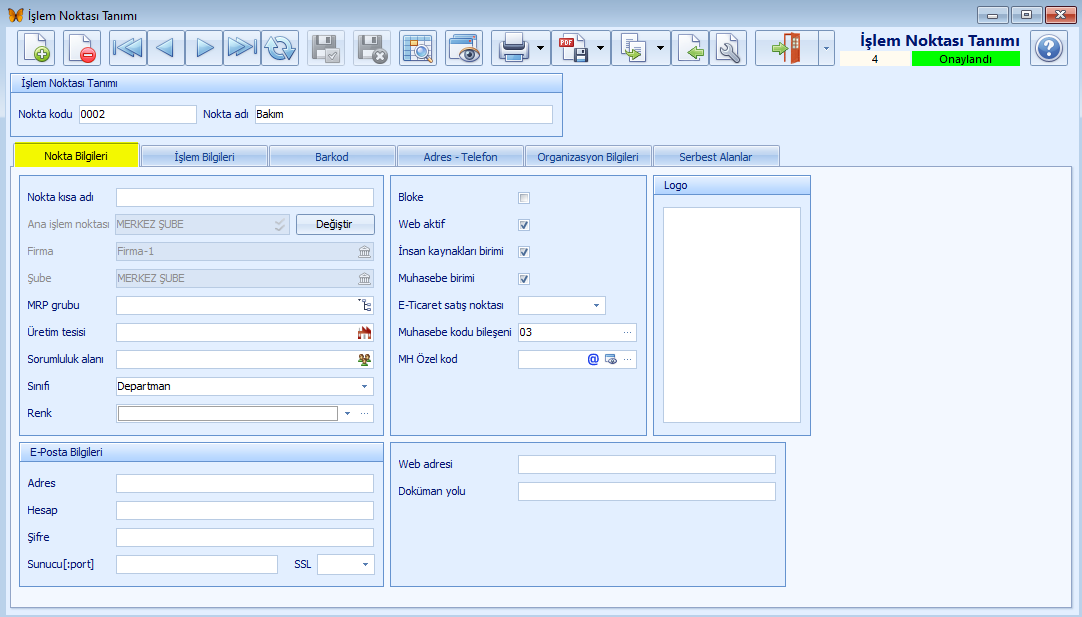 Organizasyon Bilgileri sekmesinde eğer işlem noktası