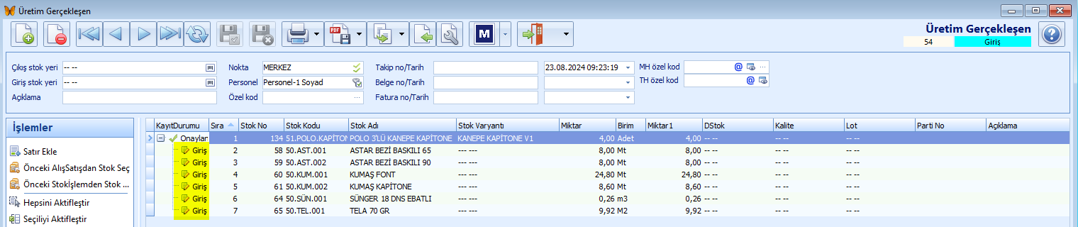 Eğer Onaylandı/Aktfi seçilirse Üretim>İş İstasyonu Vardiya Kayıtlarındaki listenen vardiya kaydının içinde girilince Gerçekleşen Girişi sekmesindeki iş emrine tıklanarak açılan pencerede üretim adet, birim vb. bilgisi girilerek Tamam butonuna tıklanca üretimde harcanan malzemelerin stok işlemi yapılır.İşlemler>Stok İşlemleri penceresinde Üretim Gerçekleşen Girişi kaydının durumu sistem tarafından Akitf yapılır.
